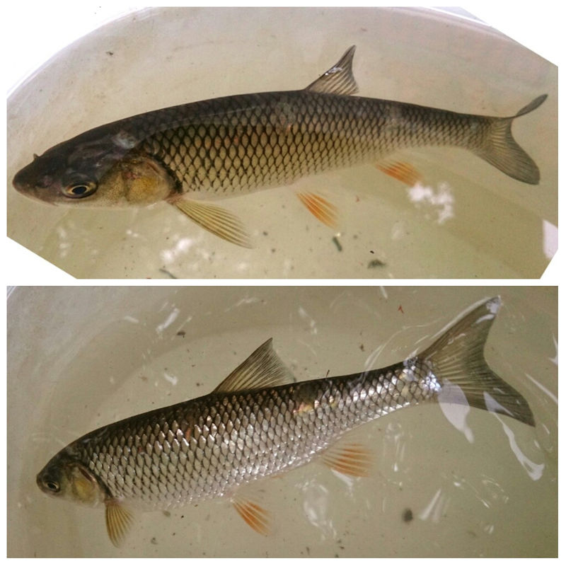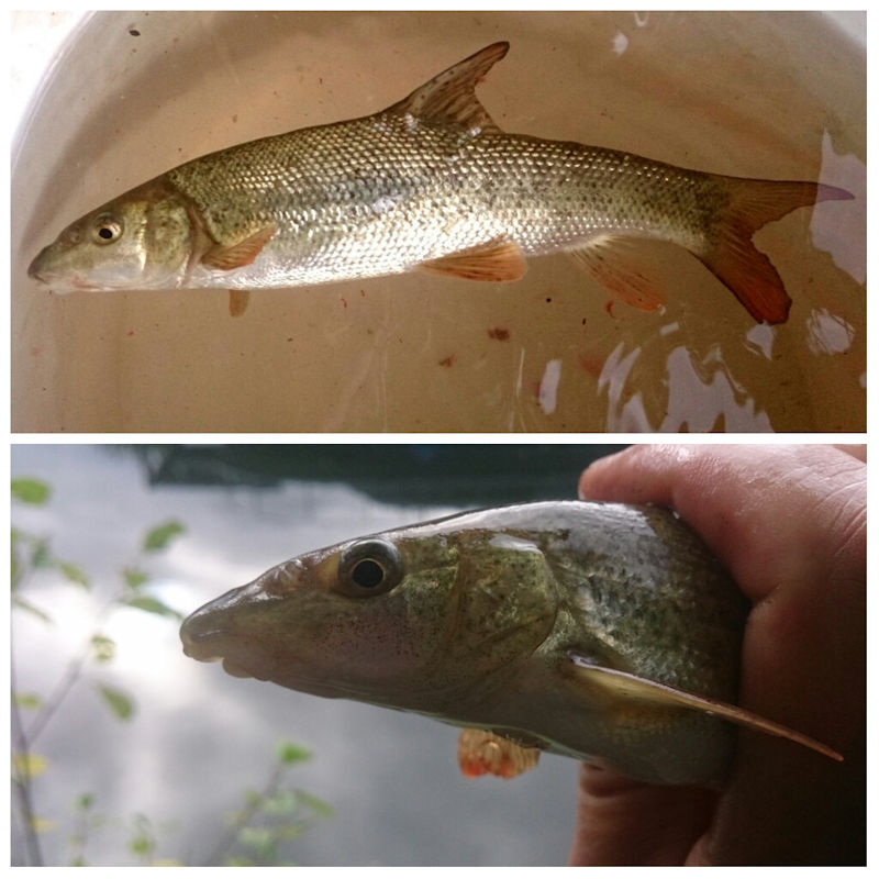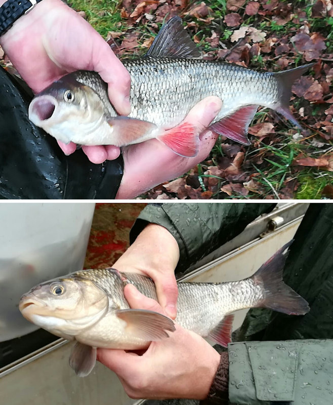 Mitbesatz von Aland (unten) im Vergleich zu Rotauge / Plötze (oben) am 7. Januar 2020.