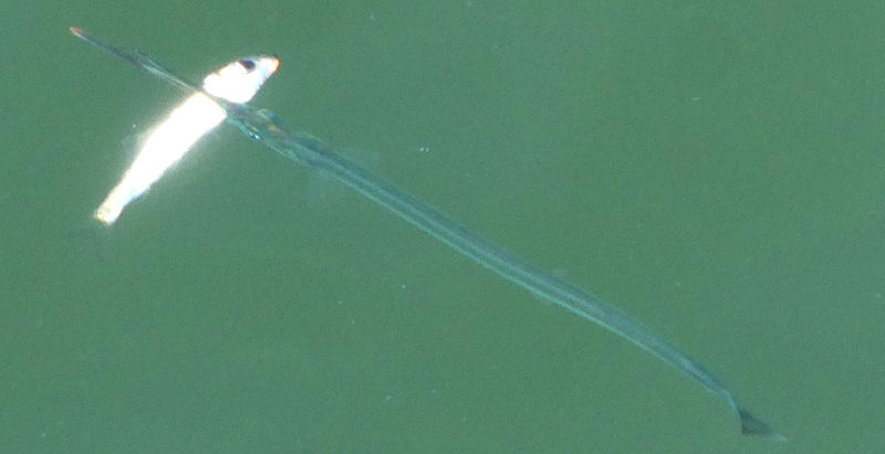 Ein kleiner Hornhecht versucht sich an einem Stichling im Nothafen am Darßer Ort bei Prerow / Ostsee am 23. Juli 2020.