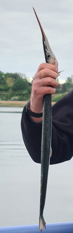Angeln von Hornhecht im Bodden Strelasund von Altefähr / Rügen aus am 20. Mai 2023.