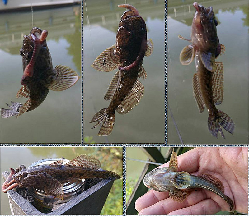 Vom Kaspischen Meer eingewanderte Marmorierte Grundel aus der Lahn in Lahnstein am 10. Juni 2016, mit einem Regenwurm kämpfend.