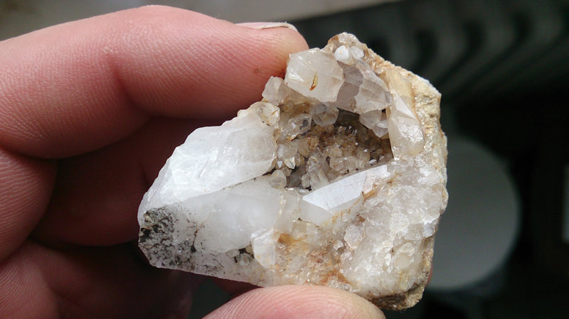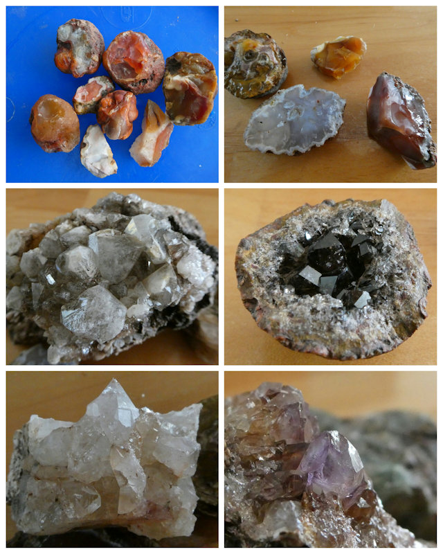 Wir sammeln Mineralien bei uns im Edelsteingebiet Deutschlands rund um unseren Wohnort Birkenfeld/Nahe, der Kreisstadt der in diesem Zusammenhang vielleicht bekannteren Edelsteinmetropole Idar-Oberstein. Sie liegen nach dem Pflügen auf dem Acker, wo sie nach Regen besser sichtbar werden, oder sind auf hiesigen sog. Rosselhalden zu finden. Vorwiegend sind das Achate, Jaspis, Quarze, Bergkristalle.