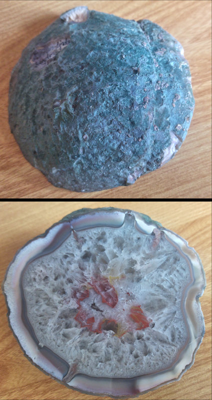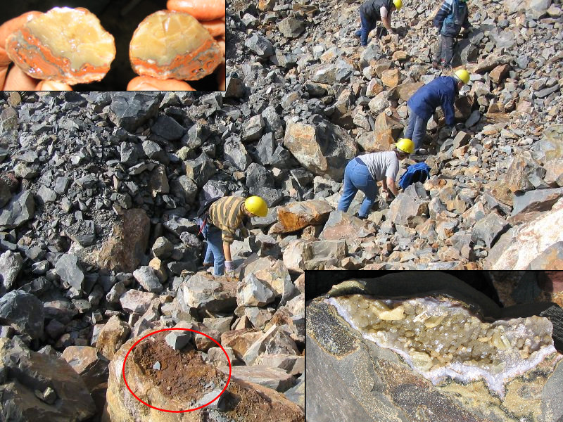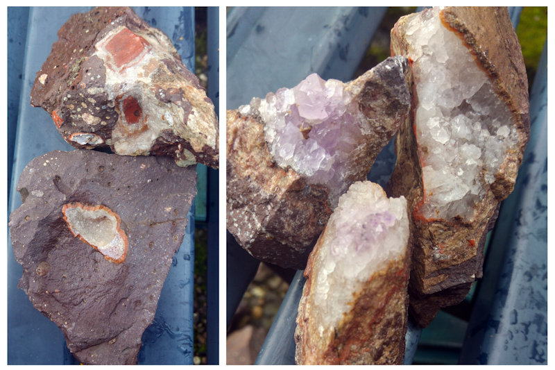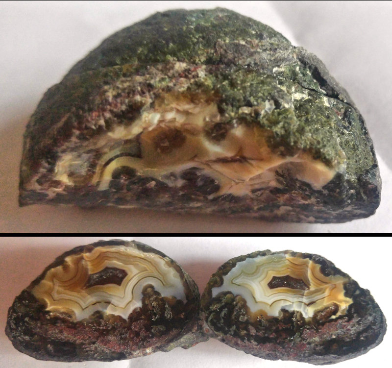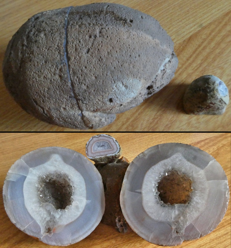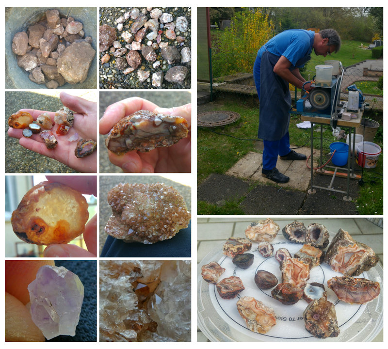Oben links: Im Fundzustand erkennt man kaum die Schätze. Einige Achat-Geoden habe ich mit der Diamanntsäge aufgeschnitten (rechts).
