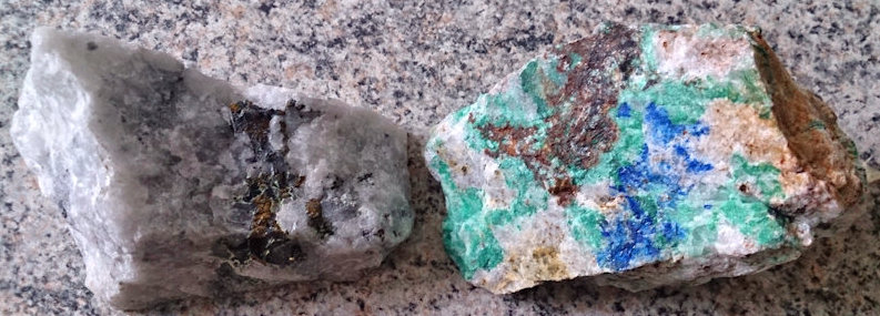 Links: Goldenes Pyrit in Quarz. Rechts: Blaues Azurit und grünes Malachit in Fluorit.