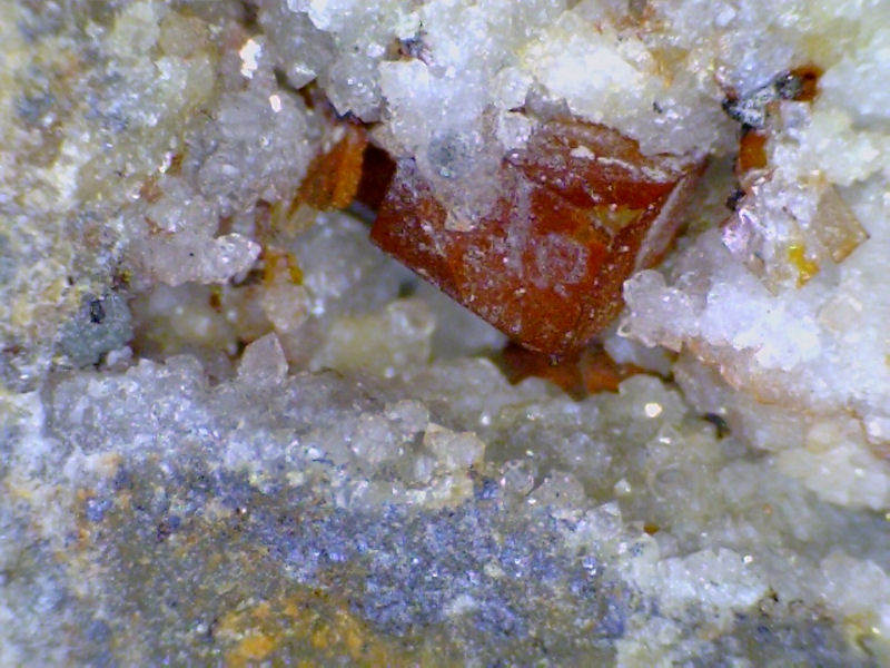 Mikroskop-Aufnahme eines Almandin-Micromounts aus der Grube Clara.
