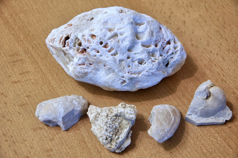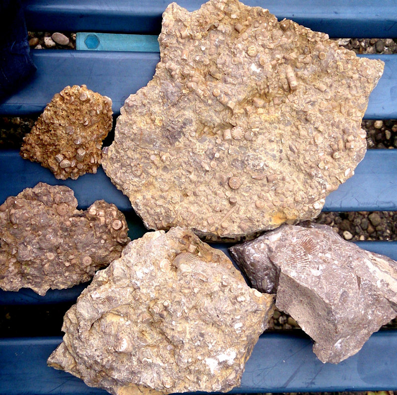 Fossile Muscheln und Seelilien-Abschnitte vom Ufer der Jagst bei Gröningen im Landkreis Schwäbisch-Hall.