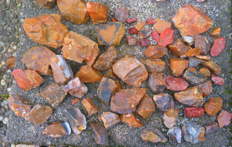 Einige bunte Steine nach einer kurzen Lesung auf einem Acker bei Birkenfeld. Achat, Karneol, Bergkristall, Rauchquarz, Amethyst.