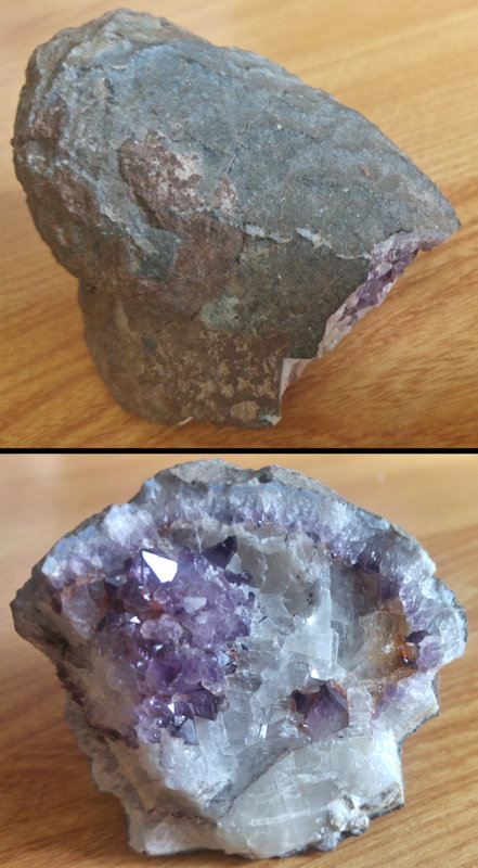 Amethyst, gefunden auf einem Acker bei Birkenfeld am 17. März 2025. Nur die Oberfläche wie im Foto oben links war bündig im Acker zu sehen.