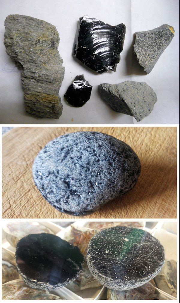in Italien. Unten: aufgeschnittene Obsidiankugeln vom Strand.