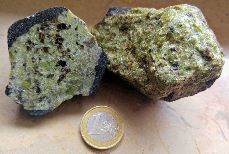 Peridodit-Schicht mit angewachsenem Olivin und Peridot an der Mineralienfundstelle für Peridot bei Ålesund.