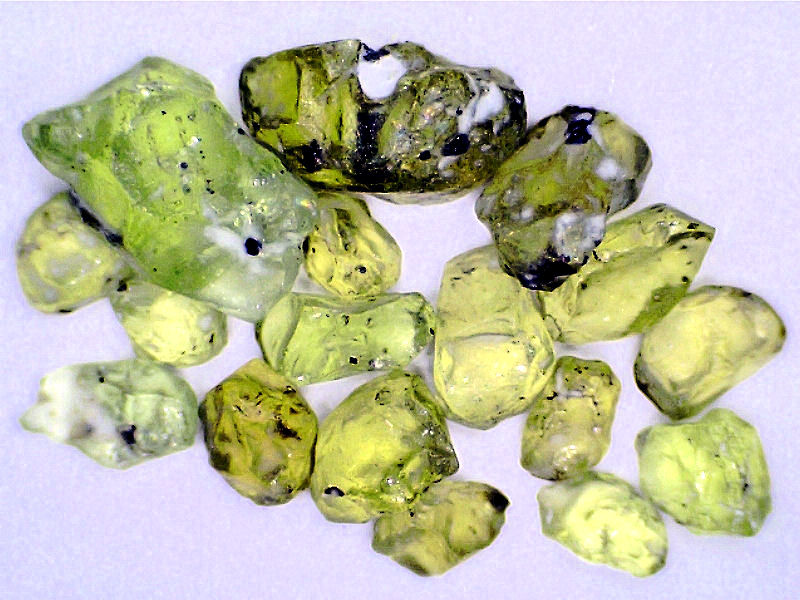 Peridot-Kristallstücke von der Mineralienfundstelle für Peridot bei Ålesund. Die klare Form von Olivin.