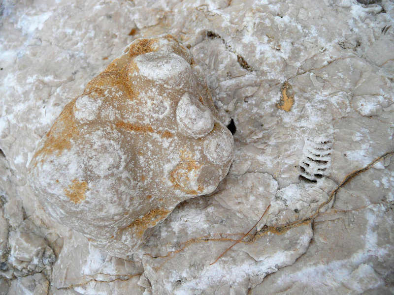 Teils auskristallisierte versteinerte Muscheln in Dolomit aus einem trockenen Wasserlauf