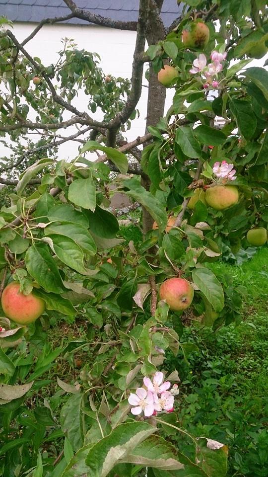 Apfelbaum mit Früchten und Blüten gleichzeitg am 4. September 2014 in Birkenfeld.