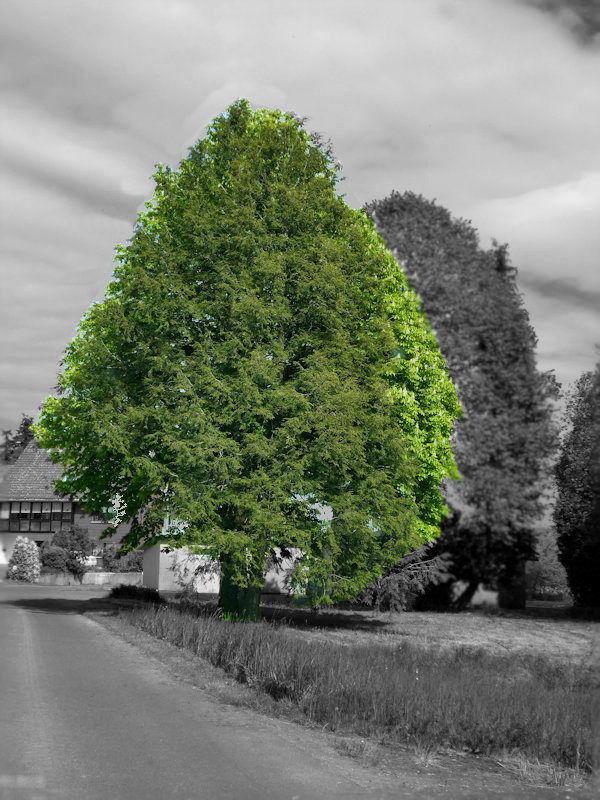 Wenn man mit dem Auto aus Brücken kommend darauf zufährt, wirkt es wie ein Baum. Eine doppelstämmige Eibe vorn, die dahinter von einer Kastanie mit hellgrünem Laub "umrahmt" wird.