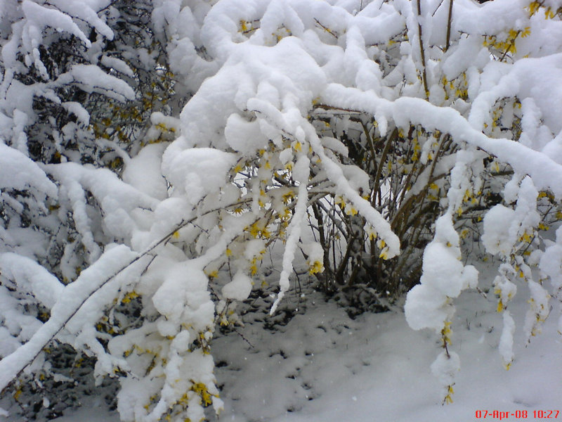 Schneebedeckte blühende Forsythien vor unserer Terrasse am 07. April 2008.