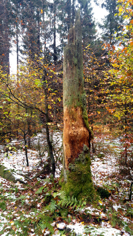 In Fresshöhe von Rotwild fehlende Rinde und Moos an einem abgestorbenen Baum im Hunsrück-Nationalpark