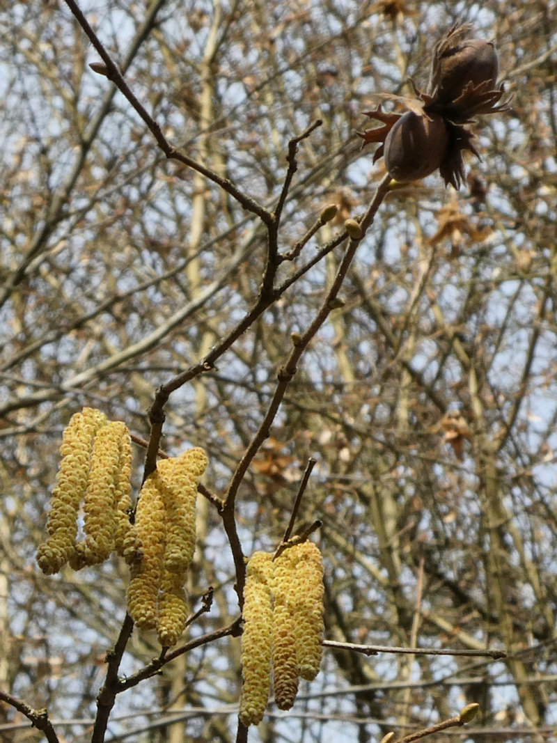 Haselnuss mit Früchten und Blüten gleichzeitig am 22. Februar 2019 am