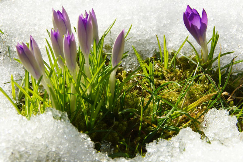 Wilde Krokusse im Schnee auf der Wiese vor unserer Terrasse am 04. März 2013.