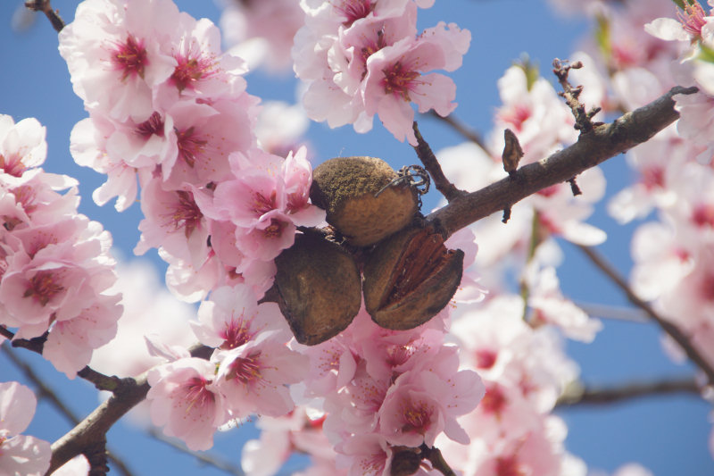 Bittermandel-Baum mit Früchten und rosa Blüten gleichzeitig am 27. März 2025 zwischen Ungstein und Bad Dürkheim in der Pfalz.