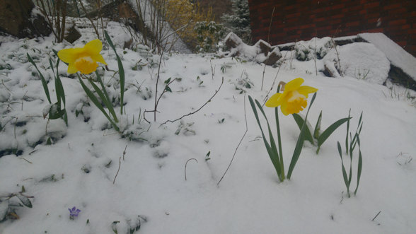 Wilde Narzissen am Haus im Schnee am 7. April 2021.