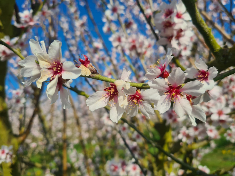 Mandelblüte am 27. März 2025 bei Freinsheim in der Pfalz. Weiße Süßmandeln.