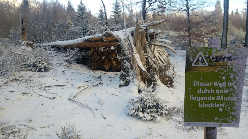 Im Hunsrück-Nationalpark bleiben umgeknickte Bäume liegen. Foto vom 18. Januar 2019. Man beachte das wichtige Hinweisschild. 😜
