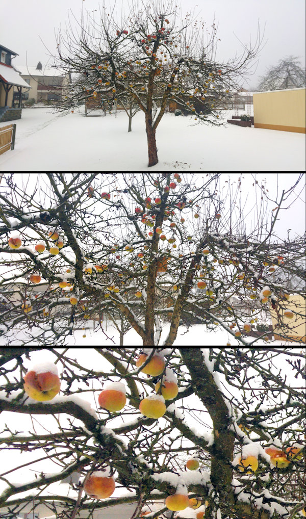 "Winterapfel"-Baum am 16. Dezember 2018, Dritter Advent, in Birkenfeld. Trotz Frost hängen die Äpfel immer noch komplett am Baum; nun bereits mit Schnee bedeckt.