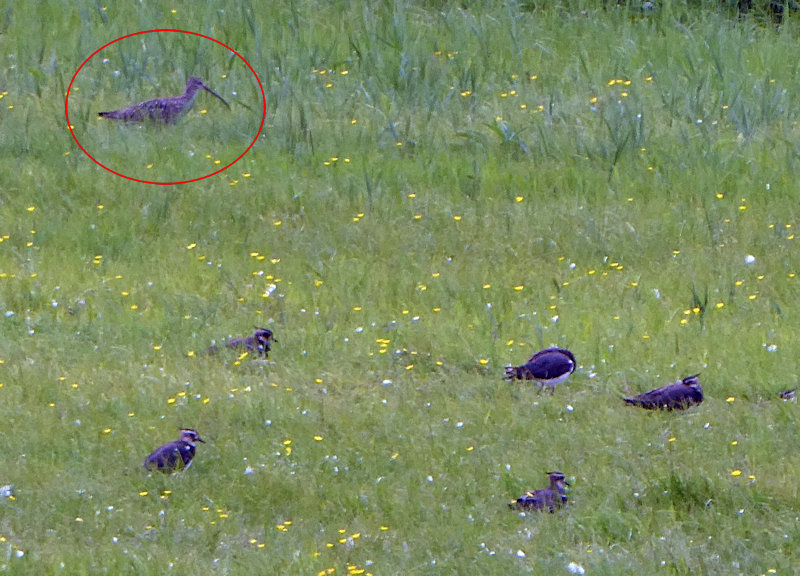 Großer Brachvogel neben Kiebitzen in Buschenhagen bei Stralsund am 19. Juli 2019.