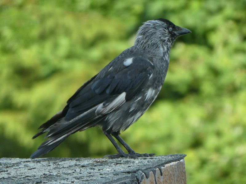 Gescheckte (leuzistische) Dohle in Stralsund am 19. Juli 2020.