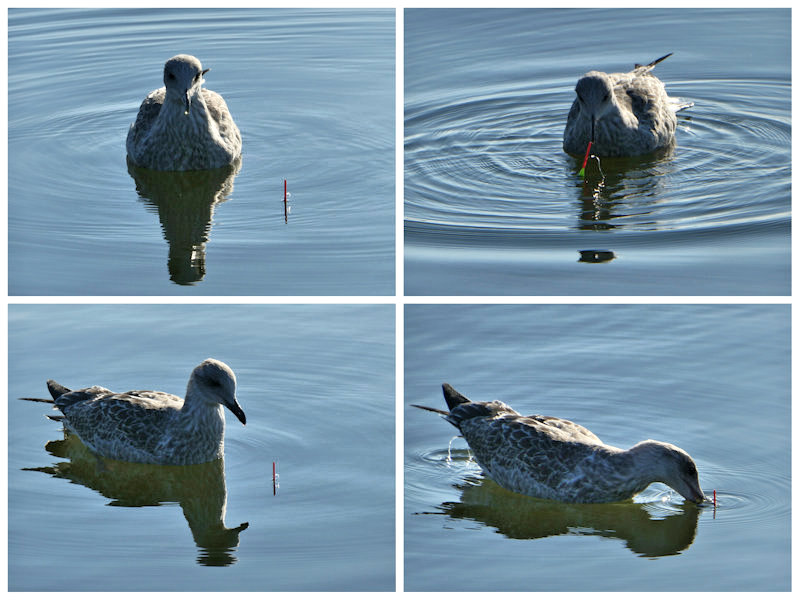 Eine junge Silbermöwe interessiert sich im Strelasund in Stralsund am 17. Juli 2017 für meine Angelpose.