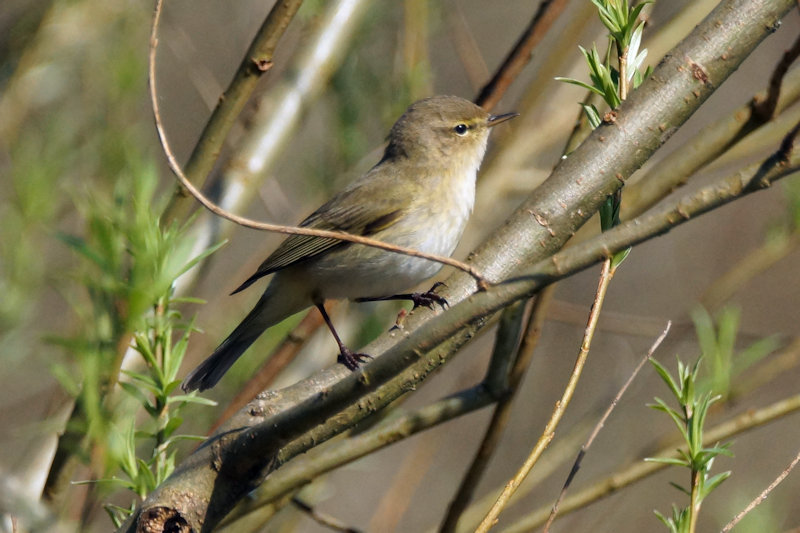 Zilpzalp / Weidenlaubsänger im Weidengebüsch am Badeweiher in Birkenfeld, am 8. April 2020.
