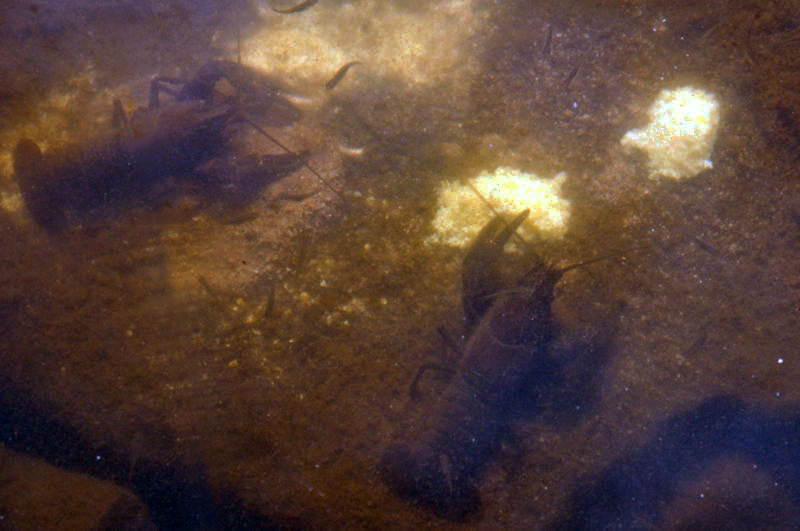 Amerikanische Flusskrebse nebst kleinen Fischen auf dem Grund der Nahe in Georg-Weierbach nach dem Einwerfen von hellen Maispellets.