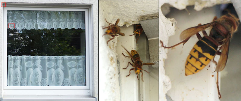 Hornissen bauten sich ein Nest im Rolladenkasten über unserem Küchenfenster.
