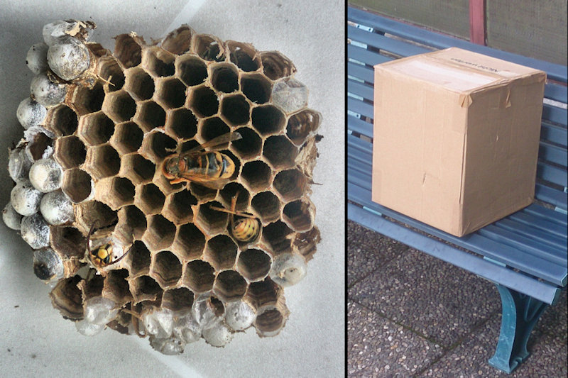 Innenansicht eines kleinen Teiles des Hornissennests und das endgültig verpackte Hornissennest zum Abtransport in den Wald am 18. Juli 2015.