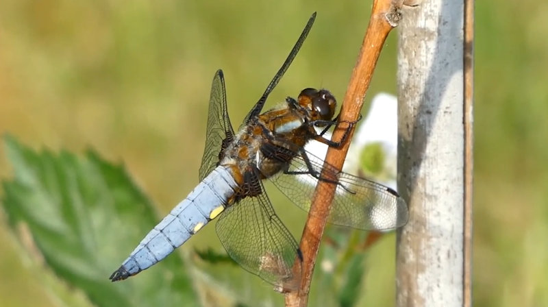 Eine große Plattbauchlibelle an einer Brombeerranke im Garten.