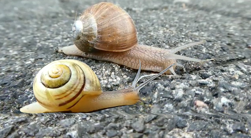 Eine Weinbergschnecke und eine Garten-Bänderschnecke nacheinander unterwegs zu unserem Vorgarten. Beide sind nützlich.