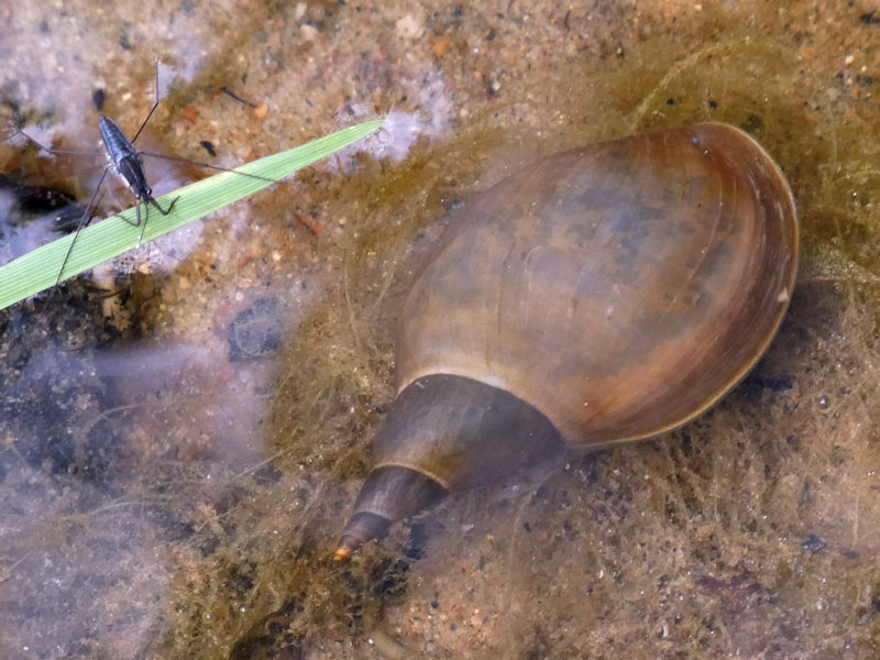 Spitzschlammschnecke im Rödliner See in Carpin / Mecklenburg am 27. Juli 2020. Links daneben ein Gemeiner Wasserläufer.