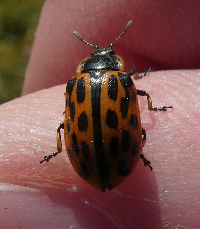Ein seltener Gefleckter Weidenblattkäfer im heimischen Garten auf meinem Finger, am 6. April 2020.